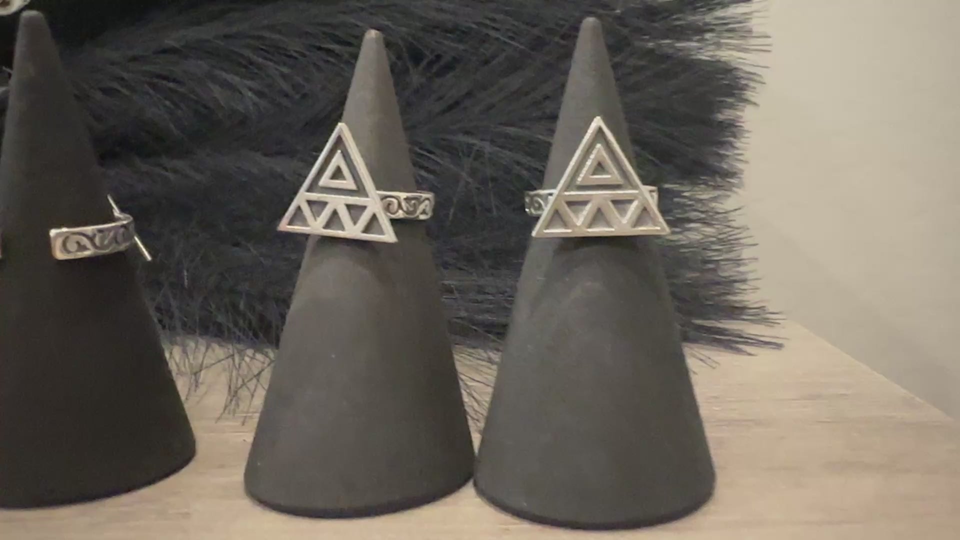 Triangle abstract ring made out of sterling silver with detail on the ring band and an open ring band.